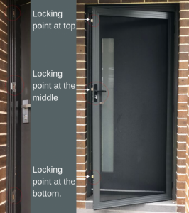 Open the hinged or sliding security screen door. Ensure the top and bottom locking points are retracted. If they are extended, turn the snib. The snib is a small lever on the indoor side of the door handle.